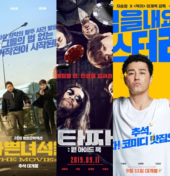 2019년 9월 추석 극장가에서 동시에 맞붙은 '나쁜녀석들: 더 무비' '타짜: 원 아이드 잭' '힘을 내요, 미스터리'