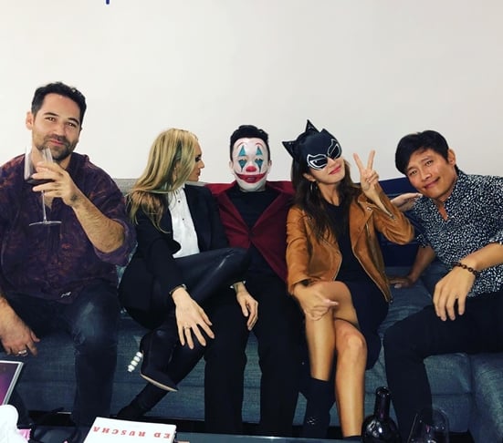 이민정은 캣우먼 가면을 쓰고 브이자를 그리고 있으며, 이병헌도 웃고 있고, 조커 분장을 한 사람도 시선을 사로잡는다.