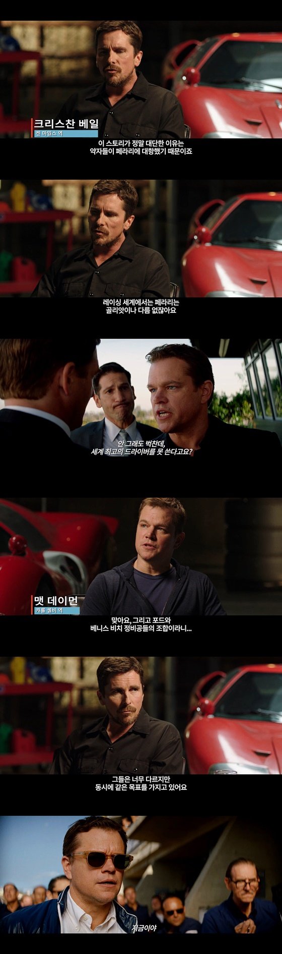 공개된 영상을 통해 공개된 맷 데이먼, 크리스찬 베일은 지금까지 본 적 없는 역대급 조합으로 시선을 사로 잡는다. 타협없는 승부사 켄 마일스 역을 맡은 크리스찬 베일은 "이 스토리가 정말 대단한 이유는 약자들이 페라리에 대항했기 때문이다"라며 존경심을 드러냈다. 레이싱 세계에서는 골리앗이나 다름없는 페라리에 도전한 두 남자 케롤 셸비에 대한 박수를 보낸 것.