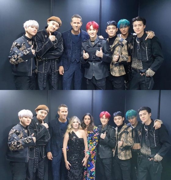 공개된 사진 속 세훈은 엑소 멤버들과 함께 영화 '6언더그라운드'에 출연한 배우인 라이언 레이놀즈와 멜라니 로랑, 아드리아 아르조나와 사진을 찍고 있다.