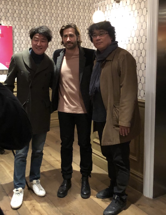 할리우드 배우 제이크 질렌할이 봉준호 감독의 '기생충' 스크리닝을 후원했다. 제이크 질렌할과 봉준호 감독, 송강호가 함께한 모습이 포착됐다.