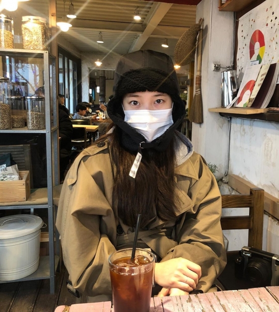 또 다른 공개된 사진에서 수지는 마스크로 얼굴을 가린 채 카메라를 응시하고 있다. 수지는 눈만 빼꼼 내밀어도 여전히 빛나는 아름다운 미모를 자랑했다.