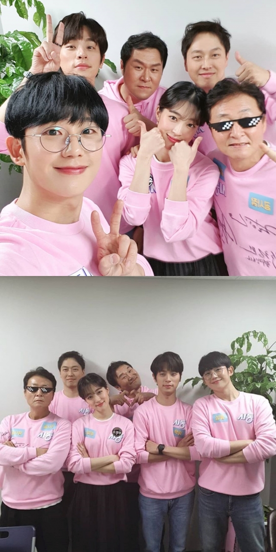 공개된 사진 속 정해인은 자신과 영화 '시동'에 함께 출연하는 배우 박정민과 최성은, 김종수, 윤경호, 김경덕과 함께 '시동' 홍보 티를 입고 사진을 찍고 있다.