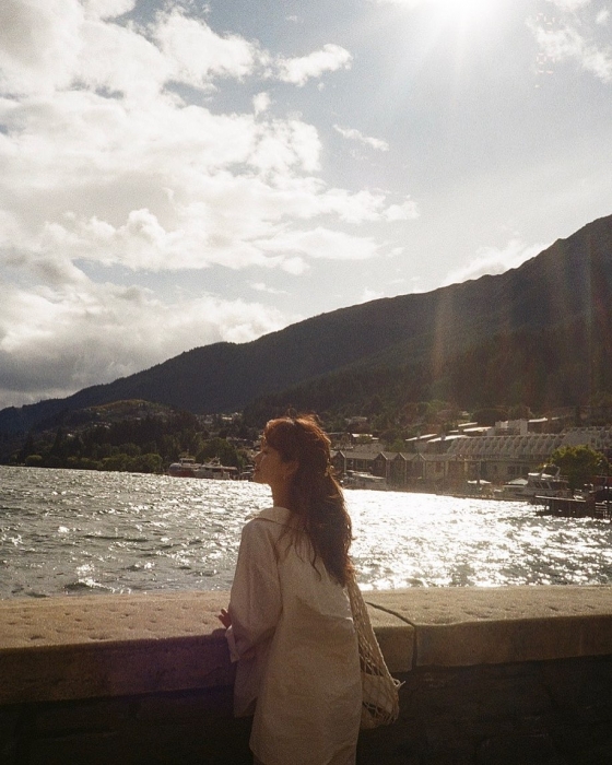 공개된 사진 속 원진아는 뒤로 돈 채 옆을 응시하고 있다. 빤짝이는 물과 산을 배경으로 눈을 지그시 감고 해바라기를 하는 모습에서 평화로움이 느껴진다.