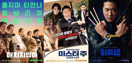 '미스터 주: 사라진 VIP'와 '히트맨'은 같은 날인 22일 동시 개봉한다. '미스터 주: 사라진 VIP'는 국가정보국 에이스 요원 태주(이성민 분)가 갑작스런 사고로 온갖 동물의 말이 들리면서 펼쳐지는 사건을 그린다. 앞서 '해치지않아'가 사람과 동물을 넘나드는 1인 2역의 활약이 그려진다면, '미스터 주: 사라진 VIP'는 이성민, 김서형, 배정남 그리고 군견 알리의 팀플레이를 엿볼 수 있다. 이성민과 배정남은 지난해 한 예능프로그램에서 '미스터 주: VIP' 100만 관객 돌파 공약을 내세워 화제를 모으기도 했다.