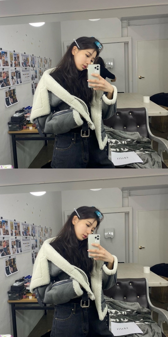 공개된 사진 속 수지는 메이크업을 받는 도중 셀카를 찍고 있다. 양털 가죽 무스탕에 올 검은색 패션으로 시크한 매력을 뽐냈다.