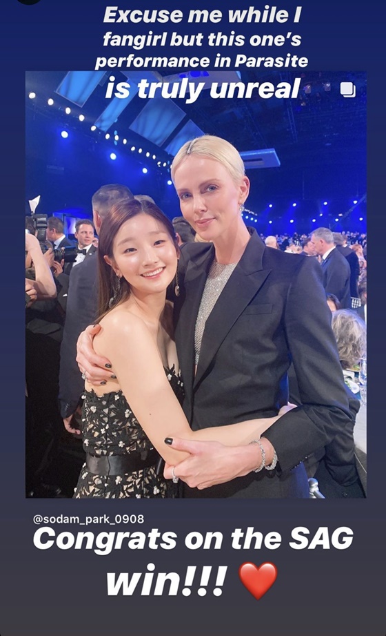 ○...샤를리즈 테론이 자신을 향해 팬심을 드러낸 박소담에게 화답했다. 최근 샤를리즈 테론은 자신의 인스타그램 스토리에 박소담과 함께한 사진을 게재했다. 이와 함께 "실례일 수도 있지만 내가 박소담을 애정하는 동안 '기생충'에서의 연기는 정말 비현실적이었다"고 적었다.또 샤를리즈 테론은 박소담의 인스타그램 아이디를 태그하며 "SAG(Screen Actors Guild Awards) 수상을 축하한다"고 했다. 앞서 박소담은 자신의 인스타그램에 샤를리즈 테론과 함께 찍은 사진을 게재하며 애정을 드러냈다. 이에 샤를리즈 테론은 해당 글에 직접 "너무 사랑스러운 너를 만났다"고 남겼다.