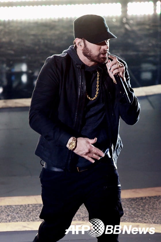 이날 에미넴은 축하 공연을 위해 무대에 올랐다. 그는 '8마일'의 OST인 'Lose Yourself'에 맞춰 무대를 선보였다.