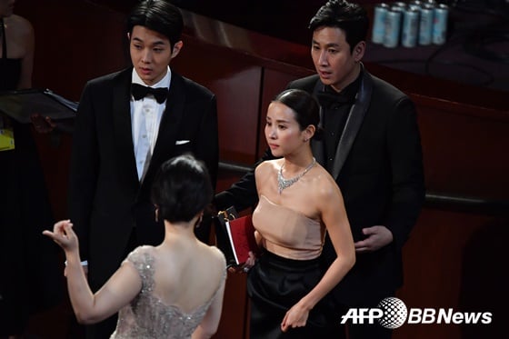 봉준호 감독은 "여기에 이 영화를 함께 만든 배우와 스태프가 다 와 있다. 사랑하는 송강호, 이선균, 이정은, 박명훈, 장혜진, 조여정, 박소담, 최우식 멋진 배우들"이라며 배우와 스태프의 이름을 불렀다. 이에 이선균은 자리에서 일어나 환호를 유도했다. 최우식은 이선균의 옆에서 손키스를 날렸고, 조여정과 이정은 장혜진 역시 박수를 보냈다.