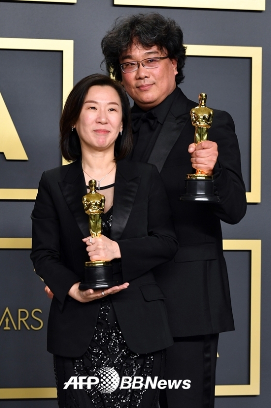 '기생충' 제작사 바른손이앤에이의 곽신애 대표는 "말이 안나오네요. 상상도 해 본적이 없는 일이 실제로 벌어지니까 너무 기쁩니다. 지금 이 순간에 뭔가 굉장히 의미 있고 상징적이고 시의적절한 역사가 쓰여진 기분이 듭니다. 이러한 결정을 해주신 아카데미 회원분들에 경의와 감사를 드린다"라고 전했다.