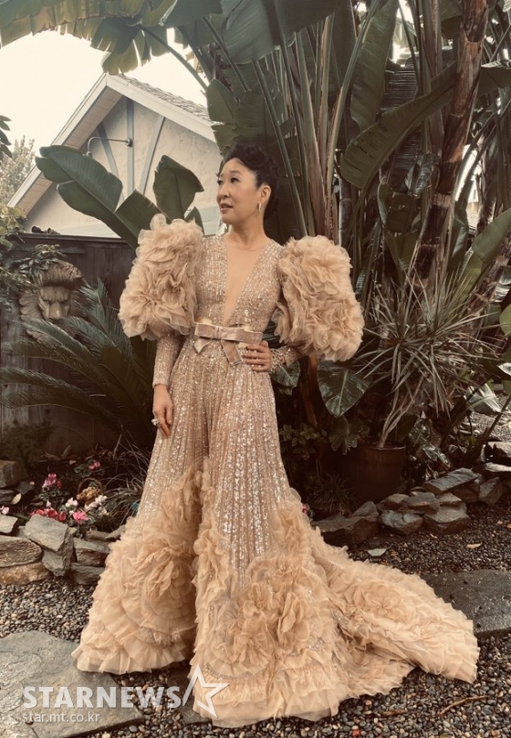 10일 산드라 오는 자신의 인스타그램에 "영화 '기생충' 축하드립니다. 정말, 정말로 한국인인 것이 자랑스럽습니다"라는 글과 함께 고운 드레스 자태를 뽐냈다.