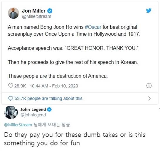 영화 '기생충'이 제 92회 미국 아카데미 시상식 작품상 감독상 각본상 국제장편영화상 등 4관왕에 오른 가운데, 한 방송인이 외국어 영화가 아카데미를 휩쓴 것에 대해 볼쾌감을 드러냈다. 미국의 보수 성향 뉴스 블레이즈 TV의 존 밀러 기자가 망언을 한 것에 대해 가수 존 레전드가 일침했다.