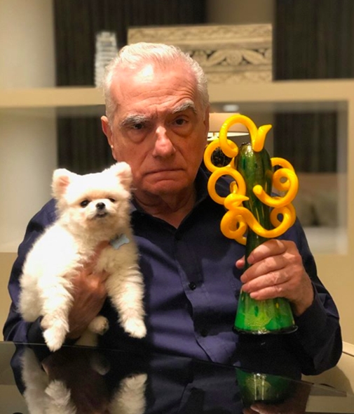 마틴 스콜세지 감독은 11일 자신의 SNS에 셀카 사진을 공개했다. 사진 속 마틴 스콜세지 감독은 귀여운 반려견을 옆에 끼고 한 손에는 트로피를 표현하는 듯한 물체를 들고 카메라를 응시하고 있다. 특유의 근엄한 표정에 귀여운 반려견이 더해져 귀여운 컷이 탄생했다.