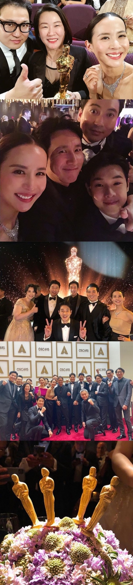 이어진 사진에서 조여정은 '기생충' 각본을 쓴 한진원 작가와 제작사 바른손이앤에이 곽신애 대표와 함께 트로피를 들고 포즈를 취하고 있다. 또 애프터 파티에 참석한 '기생충' 팀의 모습을 확인할 수 있다.