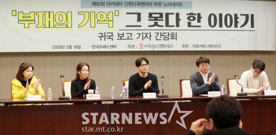 제92회 아카데미 단편다큐멘터리 부문에서 노미네이트된 영화 '부재의 기억' 그 못다한 이야기의 김미나 어머니, 오현주 어머니, 이승준 감독, 장훈 위원장, 한경수 PD가 18일 오전 서울 중구 프레스센터에서 열린 귀국 보고 기자간담회에 참석하고 있다.