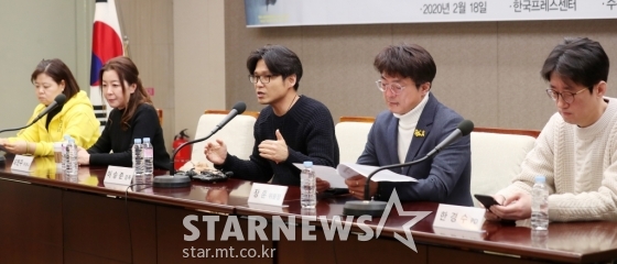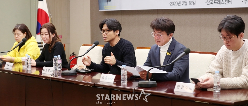 제92회 아카데미 단편다큐멘터리 부문에서 노미네이트된 영화 '부재의 기억' 그 못다한 이야기의 김미나 어머니, 오현주 어머니, 이승준 감독, 장훈 위원장, 한경수 PD가 18일 오전 서울 중구 프레스센터에서 열린 귀국 보고 기자간담회에 참석해 질의응답을 하고 있다.