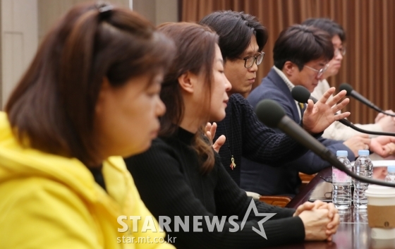 제92회 아카데미 단편다큐멘터리 부문에서 노미네이트된 영화 '부재의 기억' 그 못다한 이야기의 김미나 어머니, 오현주 어머니, 이승준 감독, 장훈 위원장, 한경수 PD가 18일 오전 서울 중구 프레스센터에서 열린 귀국 보고 기자간담회에 참석해 질의응답을 하고 있다.