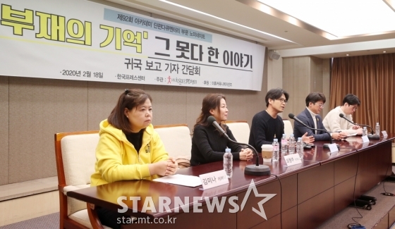 제92회 아카데미 단편다큐멘터리 부문에서 노미네이트된 영화 '부재의 기억' 그 못다한 이야기의 김미나 어머니, 오현주 어머니, 이승준 감독, 장훈 위원장, 한경수 PD가 18일 오전 서울 중구 프레스센터에서 열린 귀국 보고 기자간담회에 참석해 질의응답을 하고 있다.