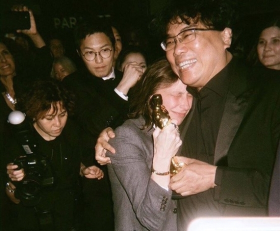 공개 된 사진 속에는 오스카 트로피를 꼭 쥐고, 봉준호 감독에 안겨 있는 셀린 시아마 감독의 모습이 담겨있다.