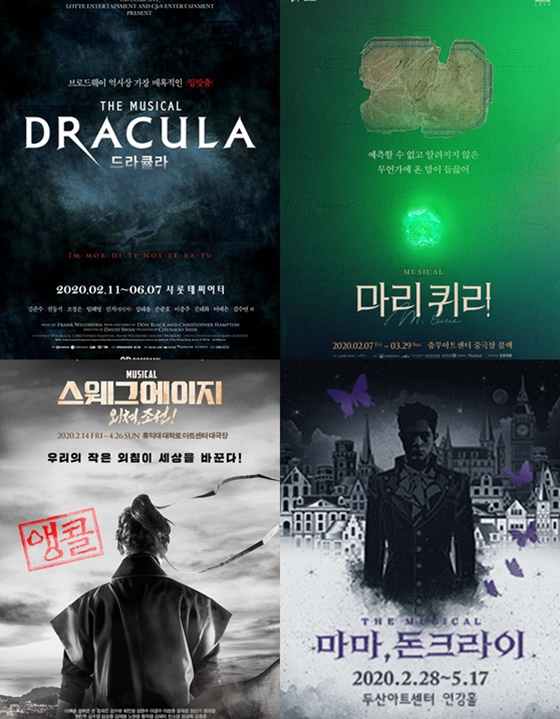 /사진=뮤지컬 '드라큘라', '마리퀴리' '스웨그 에이지 외쳐, 조선!', '마마, 돈 크라이' 포스터
