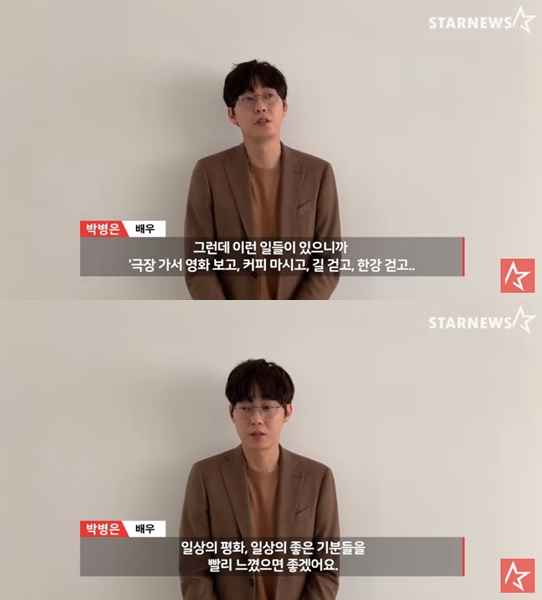 박병은은 "영화관 가고, 산책하고, 가족들과 식사하고 그런 것들이 너무나 일상이었는데 저희가 일상의 행복함을 잊고 지냈던것 같더라"라며 "이런 일들이 있으니까 극장 가서 영화 보고, 커피 마시고, 길 걷고, 한강 걷고 이런 것들이 얼마나 행복한 일상이었나 다시 한번 뼈저리게 느끼는 것 같아요. 항상 손 깨끗이 씻고 개인 위생을 철저히 한다면 우리가 이겨낼 수 있다고 생각합니다"라고 말했다.