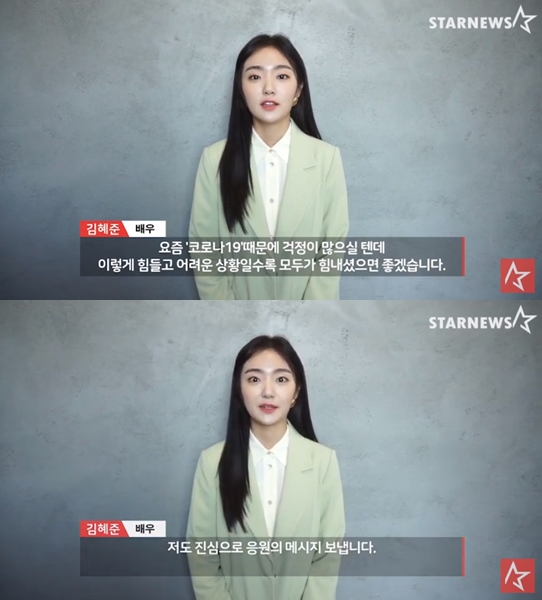 김혜준은 영상에서 "요즘 코로나19 때문에 걱정이 많으실텐데, 이렇게 힘들고 어려운 상황일수록 모두가 힘내셨으면 좋겠습니다"라며 "저도 진심으로 응원의 메시지 보냅니다"라고 밝혔다.