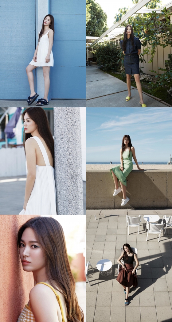 공개된 사진 속 송혜교는 봄이 연상되는 형형색색의 옷을 입고 카메라를 응시하고 있다. 이어 흰색 미니 원피스로 각선미를 공개하며 늘씬한 몸매를 자랑했다.