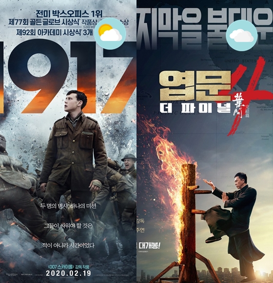'1917'은 이번 주말 5000명 이상을 동원, 누적 75만명 남짓한 관객을 기록할 것 같다. '엽문4: 더 파이널'도 5000명 가량을 동원, 누적 5만명 이하를 기록할 것으로 보인다. 코로나19로 극장이 텅 비다시피 하는 상황이 계속되고 있어 이번 주말은 역대 최저 관객치 기록을 경신할 것으로 예상된다.