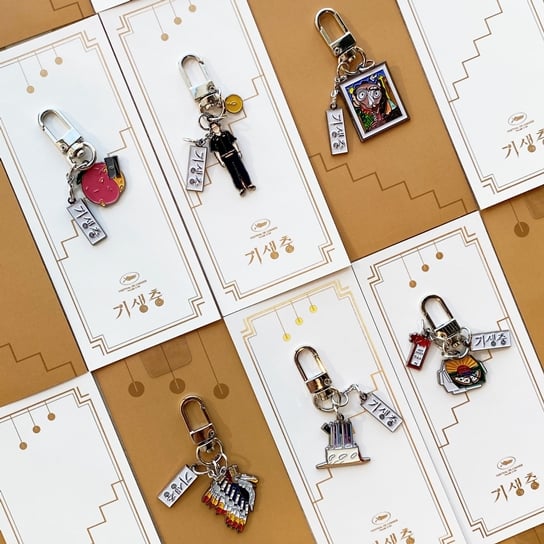 '기생충'의 시그니처인 눈을 가린 기택(송강호 분)을 시작으로 영화 속에서 관객의 눈을 사로잡았던 인상적인 소품을 활용한 키링은 전원백수 가족 기택네가 생계를 위해 접는 피자박스와 박사장(이선균 분)네 막내 다송(정현준 분)이 그린 자화상, 온 가족 취업 작전을 위해 기정(박소담 분)이가 샀던 복숭아, 인디언 머리 장식 등을 담아내며 소장 욕구를 자극한다.