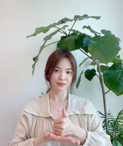 공개 된 사진 속 송혜교는 청순한 미모를 자랑하며 수어로 감사를 전하고 있다.
