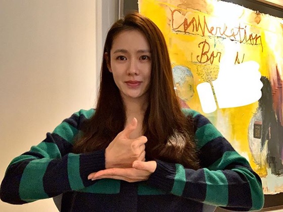 공개된 사진 속 손예진은 '덕분에 챌린지' 상징 수어 동작을 취하며 밝게 미소 짓고 있다.