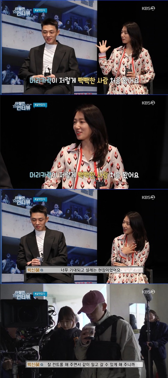 30일 오전 방송된 KBS 2TV 예능프로그램 '영화가 좋다'에서는 코너 '아찔한 인터뷰'로 꾸며져 '#살아있다'에 출연하는 배우 유아인, 박신혜가 출연했다.