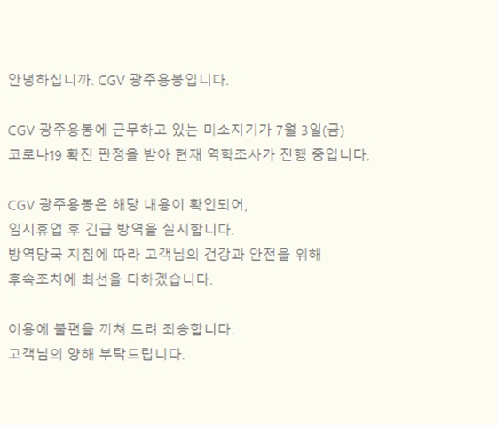 광주광역시 북구에 위치한 CGV 광주용봉점 미소지기가 신종 코로나 바이러스 감염증(코로나19) 확진 판정을 받았다. 이에 CGV 광주용봉점은 임시 휴업한다.