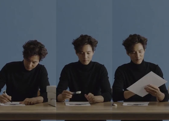 17일 패션 브랜드 올젠은 원빈의 언택트 사인회 영상을 공개했다. 공개된 영상 속 원빈은 홀로 책상에 앉아 비대면 사인을 진행하고 있다.