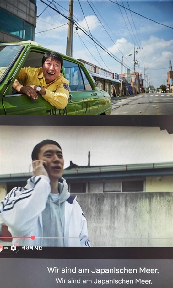 (위) '택시운전사' 스틸컷, (아래) 영화 '사냥의 시간'에서 동해를 일본해로 표시한 자막