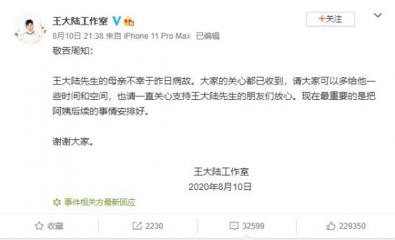 10일 왕대륙 측은 공식 웨이보를 통해 "안타깝게도 왕대륙의 어머니가 어제(9일) 돌아가셨습니다"라고 밝혔다.