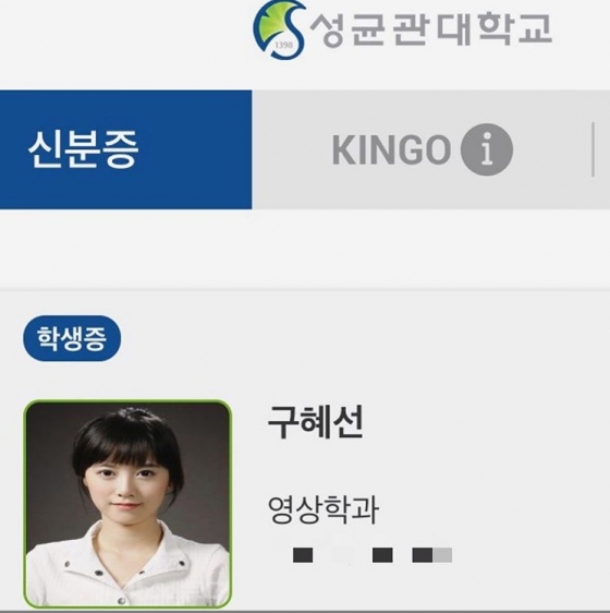 구혜선은 성균관대학교 앱 학생증을 캡처한 사진을 공개했다. 그는 15년 전 시트콤 '논스톱'을 찍을 때와 다름없는 외모를 보여주며 동안 외모를 자랑했다.