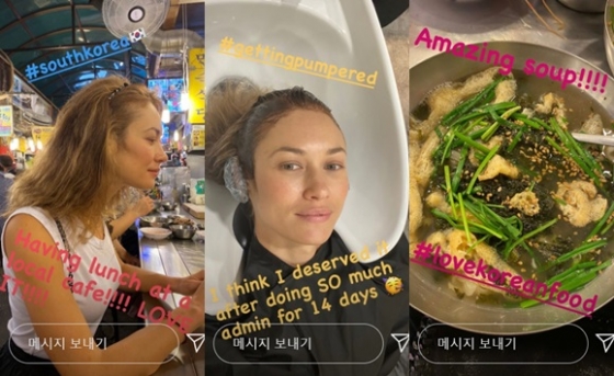 그녀는 잔치 국수를 먹으며 "맛있는 스프! 나는 한국음식을 사랑해"라고 올리는가 하면 "현지 음식 먹기. 너무 좋아"라는 사진을 올리며 즐거움을 표했다.