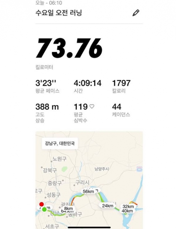 공개된 사진 속에는 라이딩을 한 거리가 나와 있다. 서울 강남께에서 양평군 양수역까지 총 73.76km를 라이딩해 놀라움을 자아냈다.