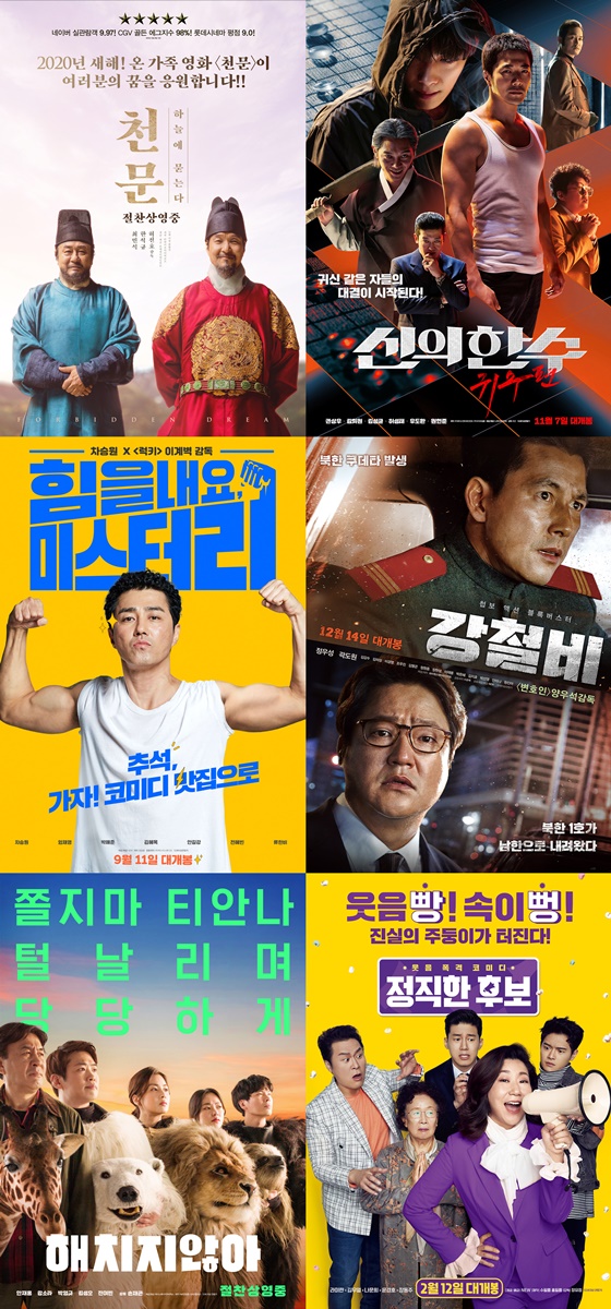 /사진=영화 '천문: 하늘에 묻는다', '신의 한 수: 귀수편', '힘을 내요, 미스터 리', '강철비', '해치지않아', '정직한 후보' 포스터