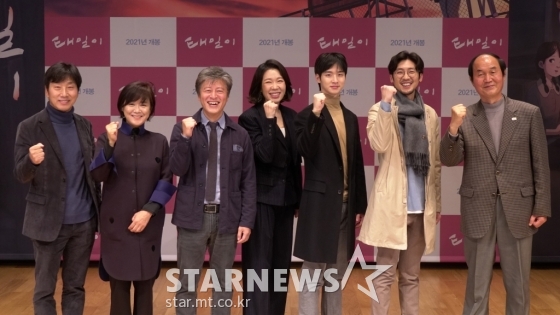 연예영화'태일이, 화이팅'[★포토]발행 : 2020.11.09 ・ 12:36이동훈 기자명필름 심재명 대표, 이은 대표, 배우 권해효, 엄혜란, 장동윤, 홍준표 감독, 이수호 전태일 재단 이사장이 9일 오전 온라인 생중계로 진행된 장편 애니메이션 영화 '태일이'(감독 홍준표) 제작발표회에서 포즈를 취하고 있다. /사진제공=명필름<저작권자 © 스타뉴스, 무단전재 및 재배포 금지>태일이추천 기사이동훈 기자기자홈좋아요 연예-영화의 인기 급상승 뉴스연예-영화의 최신 뉴스
