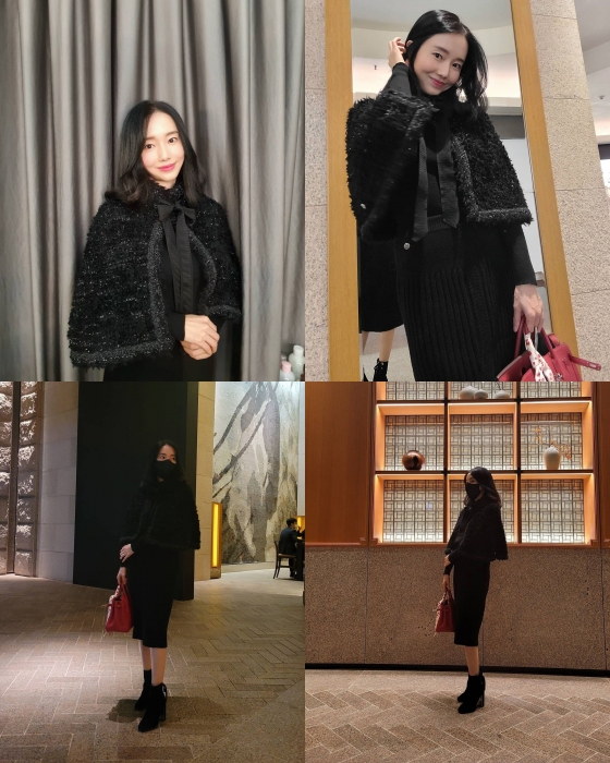 공개된 사진 속 이정현은 검은색 망토와 치마, 부츠를 신어 '올블랙' 룩을 선보였다. 마스크도 검은색으로 낀 이정현은 빨간색 백으로 포인트를 줘 패셔니스타의 모습을 보였다.