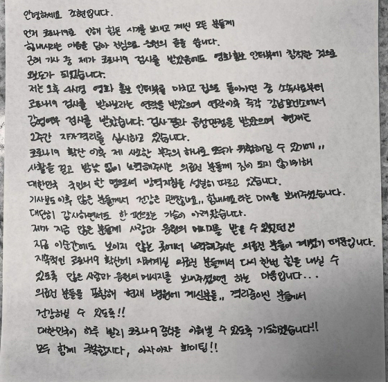 저는 오후 4시경 영화홍보 인터뷰를 마치고 집으로 돌아가던 중 소속사로부터 코로나19 검사를 받아보라는 연락을 받았으며 연락 이후 즉각 강남보건소에서 감염여부 검사를 받았습니다.