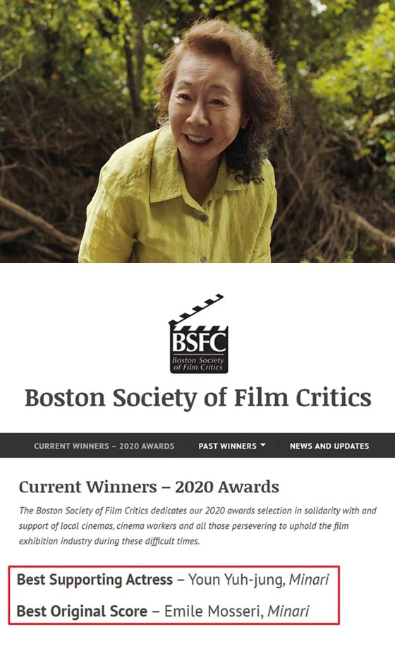 2021 오스카 유력 후보작으로 예측되는 '미나리'가 보스턴비평가협회(Boston Society of Film Critics, BSFC)에서 여우조연상, 주제가상을 수상하는 쾌거를 이뤘다. 또한 미국 인디와이어 '올해 최고의 여자배우 BEST13'에 배우 윤여정이 선정됐다.