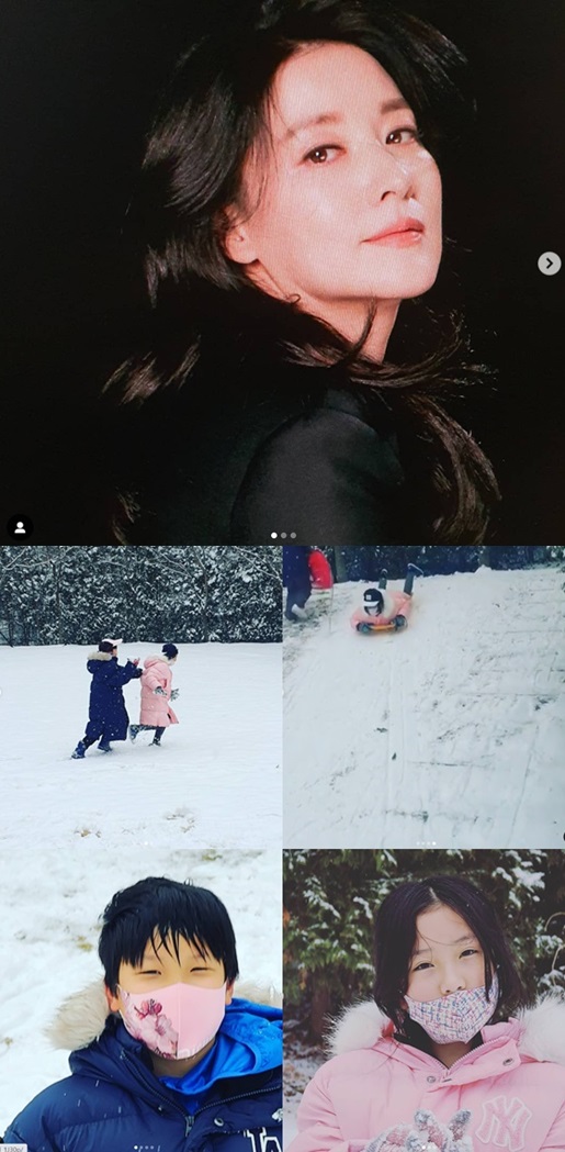 이영애는 16일 자신의 인스타그램에 "첫눈 오는 날에. 코로나 조심하세요"라며 아이들의 사진을 게재했다.