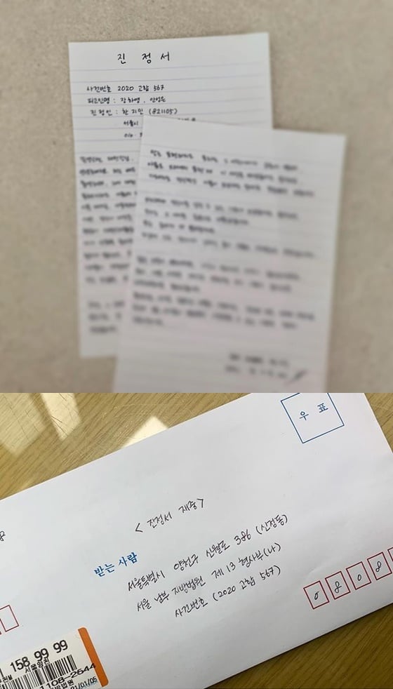 공개된 사진 속에는 어른과 아이가 마주보고 손을 잡고 있는 모습이다. 그 밑에는 '정인아 미안해'가 적혀있다. 또한 한지민이 직접 자필로 쓴 진정서가 담겼다.