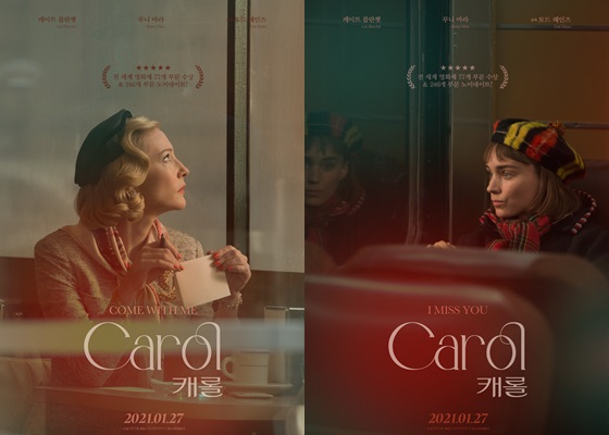 '캐롤'은 하늘에서 떨어진 운명적인 사랑을 마주하게 된 주인공 캐롤과 테레즈를 연기한 케이트 블란쳇과 루니 마라의 필모그래피에 빠질 수 없는 작품으로 눈빛만으로도 감정을 온전히 전달하는 완벽한 연기를 통해 평단과 관객 모두를 사로잡았다.