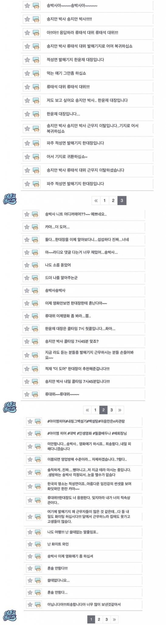 또한 '라디오 댓글 다는 거 너무 재밌어..송박사..', '혼술 안함다..', '류대위!! 한대장도 너 응원한다. 잊지마라 내가 너의 직속상관이다..', '이쯤되면 영업방해 수준이라..자제하겠습니다..', '미안합니다..송박사..영화 얘기 하시죠..죄송함다..내일 피해다니겠습니다', '#아이엠히어 #대박 #인생영화 #월클배두나 #배회장님', '#아이엠히어 #내칭그백설기 #백설탕 #마음만은n차관람'이라고 보내 웃음을 안겼다.