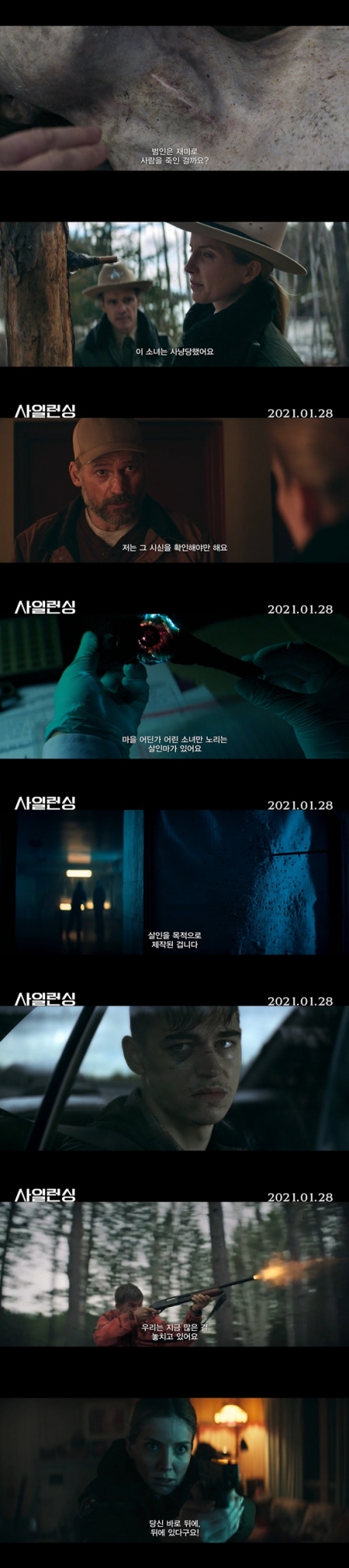 이어 5년 전 눈앞에서 딸의 실종을 목격한 레이번(니콜라이 코스터-왈도 분)이 잔혹한 인간 사냥 현장에 직접 뛰어들어가 살인마와 대적하고, 앨리스가 그녀에게 닥칠 위기를 모르는 채 사건의 비밀과 범인을 추적해가는 과정은 끔찍한 인간 사냥의 현장에 어떤 비밀이 숨겨져 있을지 궁금증을 한껏 끌어올린다. 수풀로 뒤덮인 채 조용히 관객들을 옥죄어오는 정체불명 살인마의 비주얼과 앨리스의 사고뭉치 동생 브룩스(히어로 파인즈 티핀 분)가 끔찍한 살인 사건과 연관되어 있음을 암시하는 모습은 '사일런싱'이 '소리 없는 공포'라는 신선한 설정과 함께 반전에 반전을 거듭하는 이야기로 관객들을 깜짝 놀라게 할 것으로 기대를 모은다.