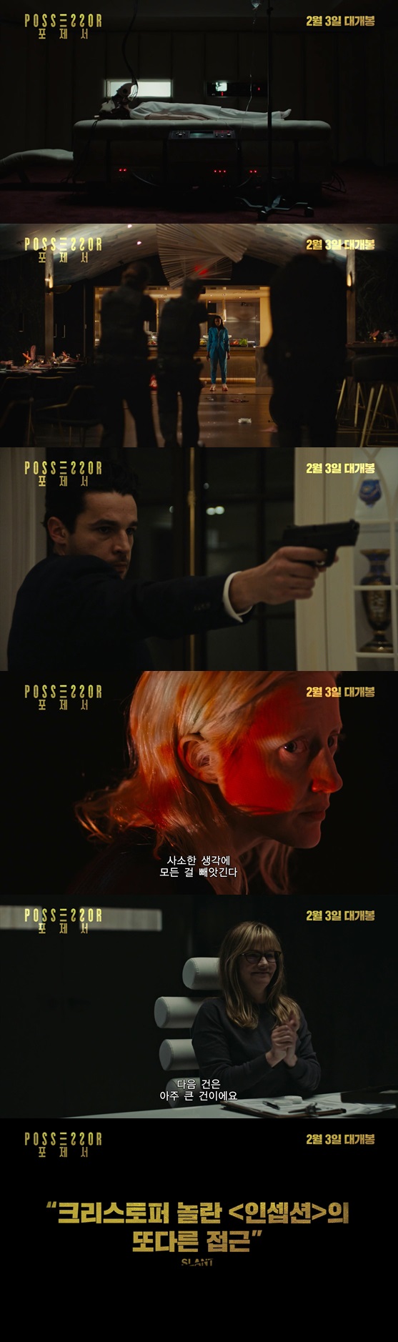공개된 예고편에서는 타인의 몸을 도용해 암살을 벌이는 조직 포제서 요원들의 작전 현장이 생생히 담겨 있어 눈길을 사로잡는다. '임플란트'라는 특수한 기술을 활용해 호스트의 의식에 침투하는 장면부터, 주변 지인들의 의심을 완벽히 피하기 위해 사전 도감청으로 말투와 습관 등을 관찰하고 학습하는 장면까지 확인할 수 있어, 영화의 독창적인 세계관이 베일을 벗음과 동시 예비 관객들의 기대감을 더하고 있다.
